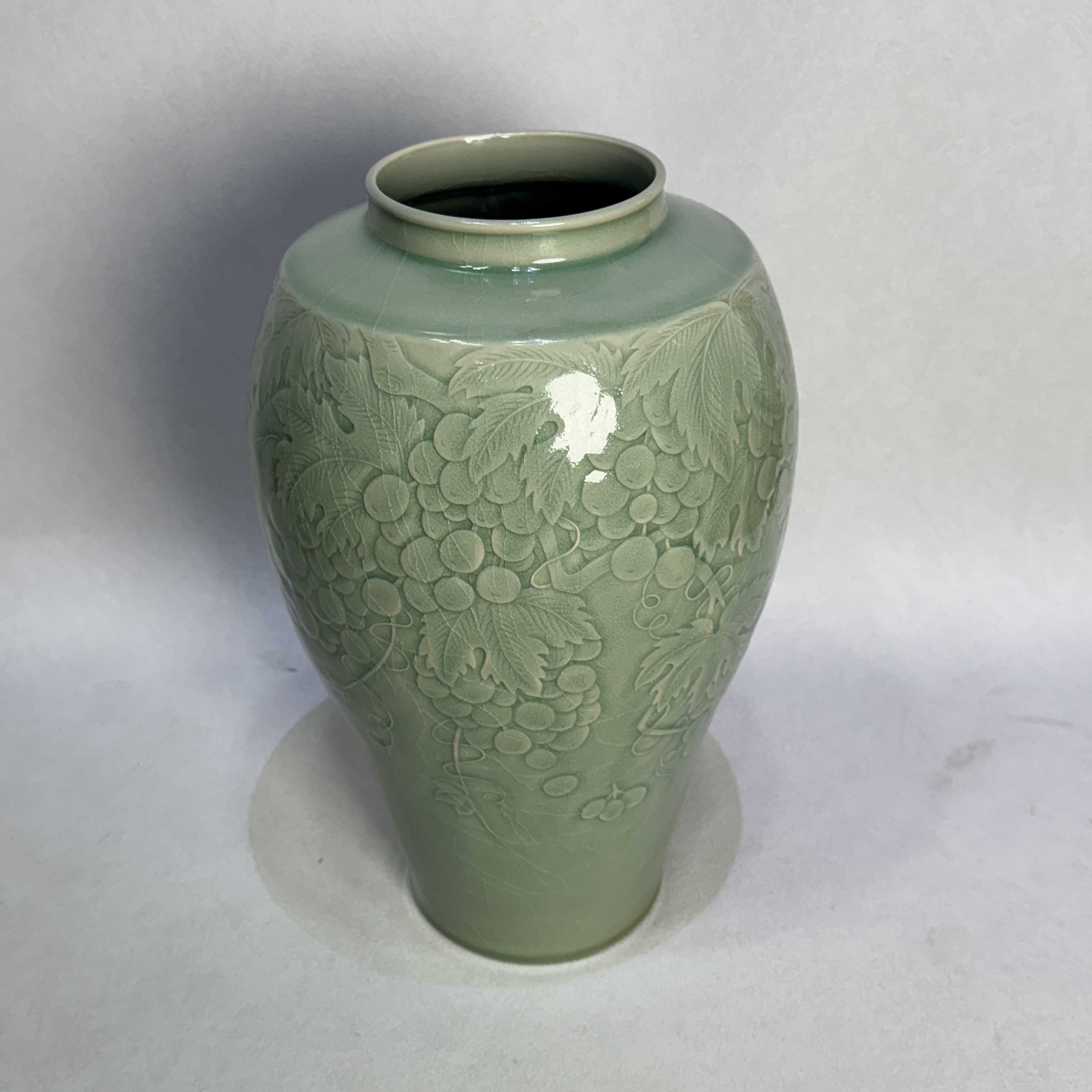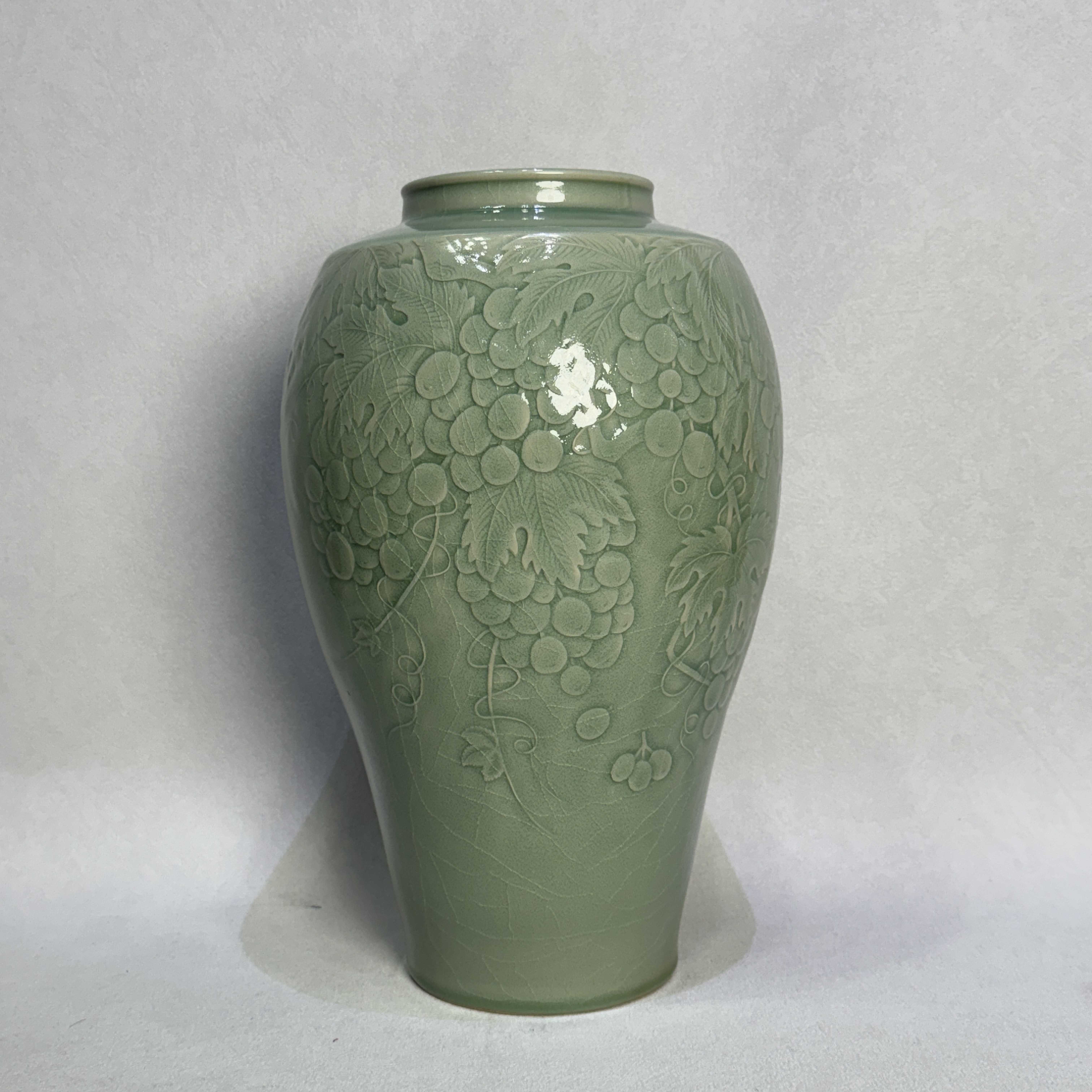 该作品采用纯手工拉坯成型,保留了手工的温度与灵性,融合浅浮雕装饰技法,以葡萄纹为主题,葡萄纹样取自自然,却通过艺术提炼,将藤蔓的缠绕、叶片的舒展、果实的丰硕进行美学重构,在瓷器的有限空间内营造出蓬勃的生命力。葡萄“多子”的寓意暗合传统吉祥文化,寄托着对丰收、富足、家族绵延的美好祈愿,传统手拉坯技艺与现代浅浮雕技法相结合通过泥与火的艺术对话,展现自然之美与人文匠心的交融。